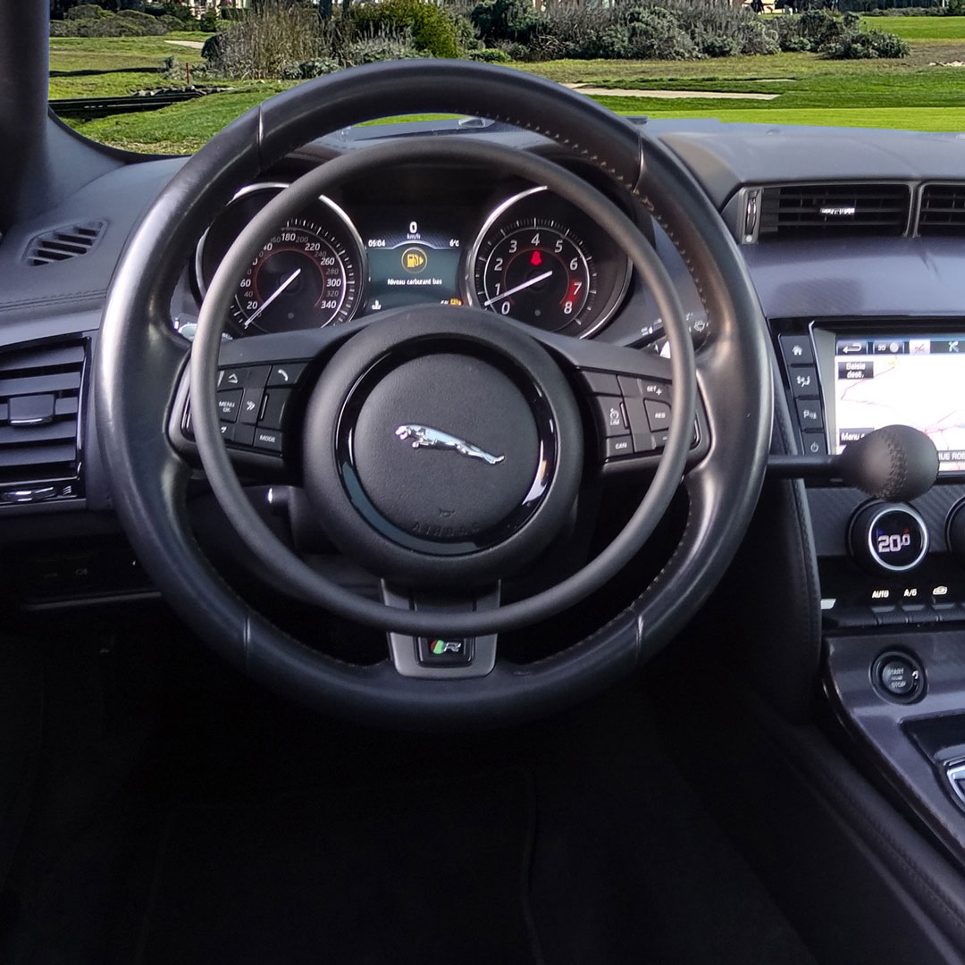 Jaguar F-Type adapted with a digital accelerator ring Darios and a main right hand brake for a driver who cannot use his legs.