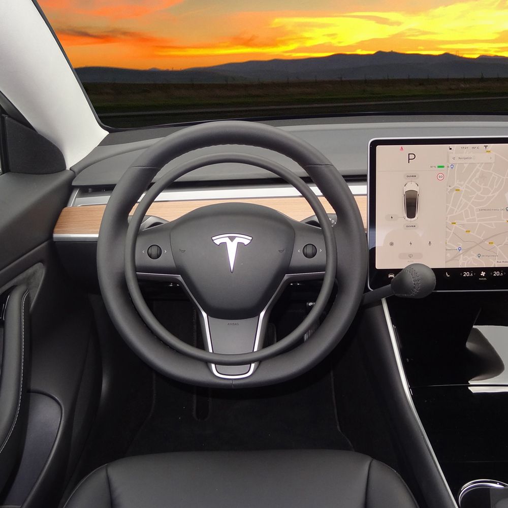 This Tesla Model 3 is adapted with the digital accelerator ring DARIOS and the main hand brake for a driver who cannot use his legs.